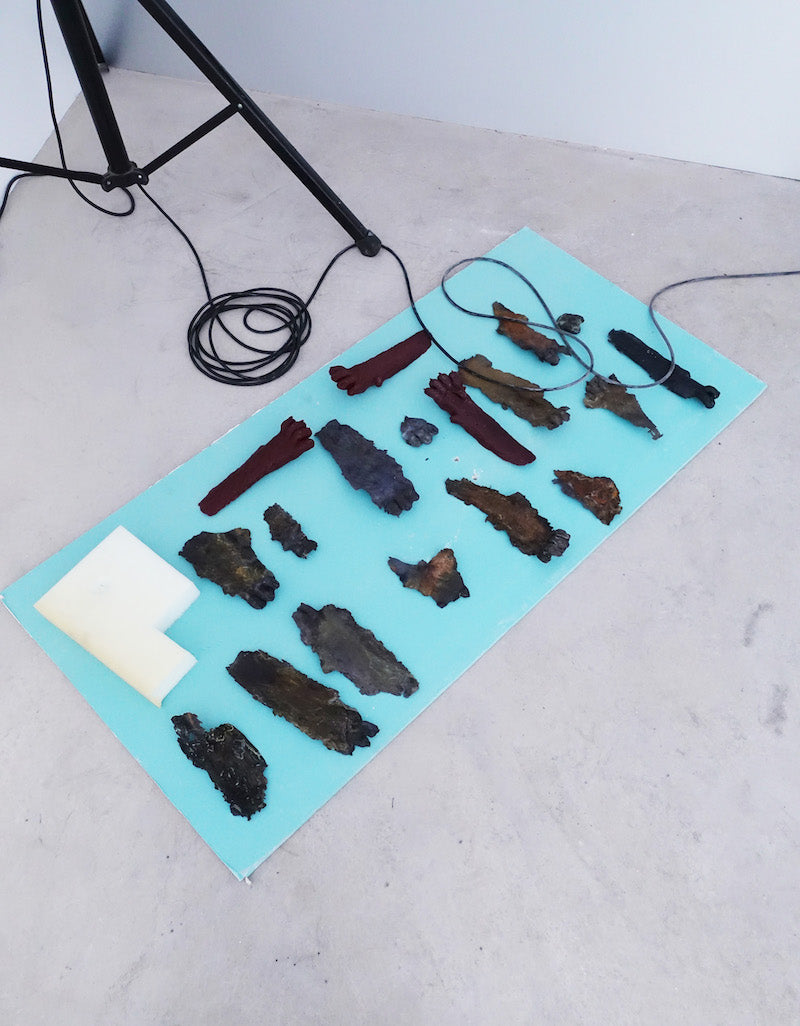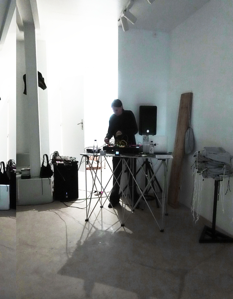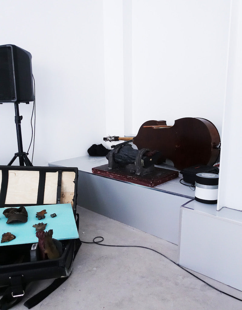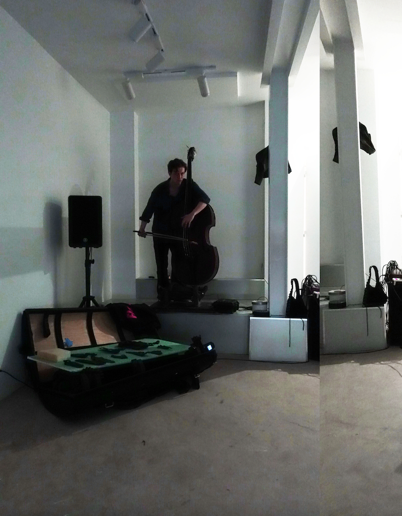 This broken attempt to synchronize sound and physical spaces inspire the installation, which consists of an hour-long sound piece played twice as a transplant for GR10K’s nearby collection. During the show, an exposed piece of string music, written by Tom, becomes hacked by Puce to create a complex rumble and dissonant stress/release in one room. This gradual assault on the music’s formal qualities are an interesting pressure point for GR10K to explore as it confronts its own terminal illness of being a creative organ trying to break out of a visceral legal conundrum. While the artist’s hack may seem small, it ultimately changes everything. The double bass is held by a muscular rock stop created by Alessandro to support the instrument and its bow strokes (personified in the collection with a defiled silver pin accessory), which although may seem corrupt, for all intents and purposes is the object’s only support system. This simple input/output exercise is a way for GR10K to practice transforming outsider cultural habits into artistic expressions that can work within the context of a routine trade event.