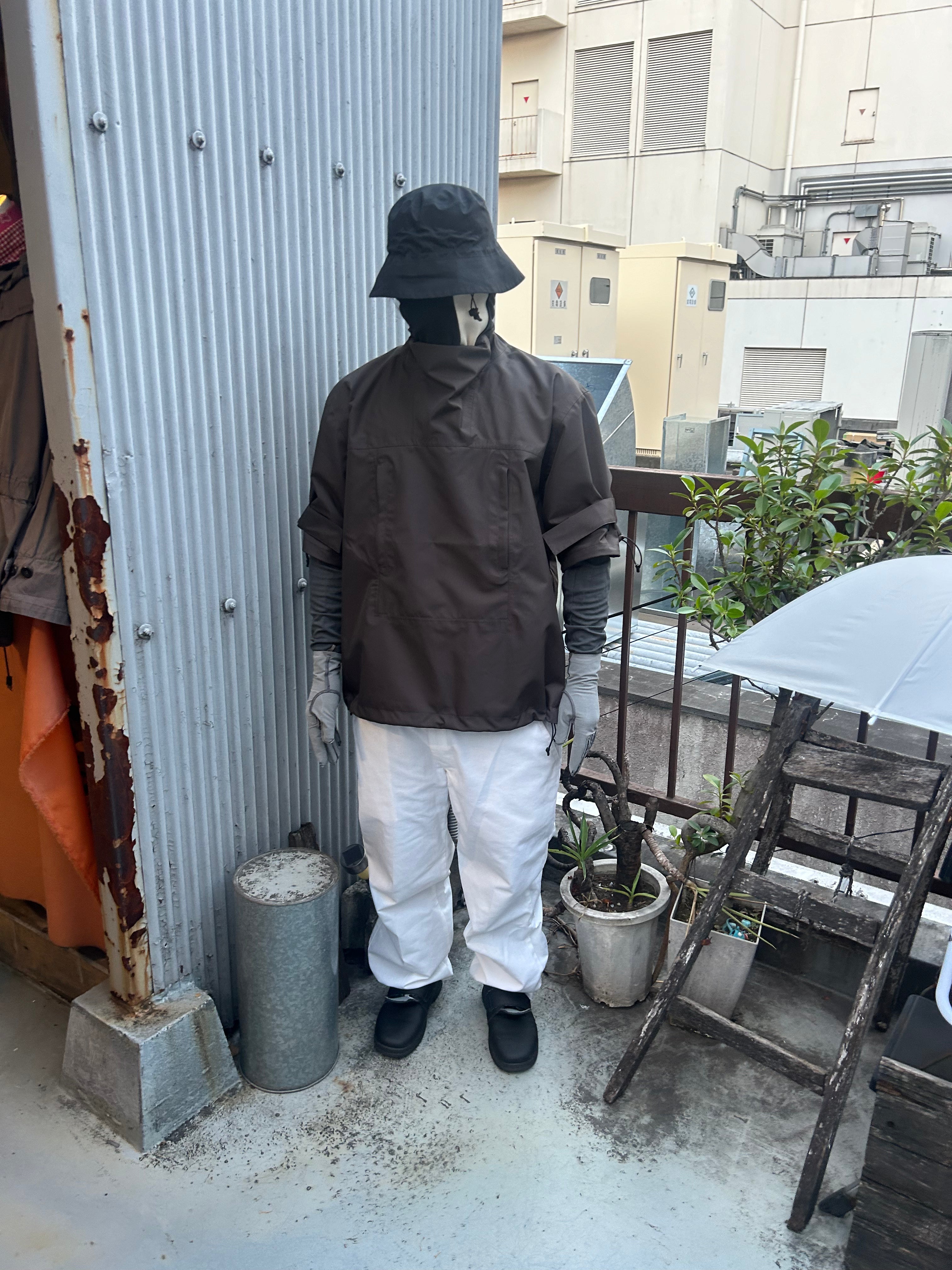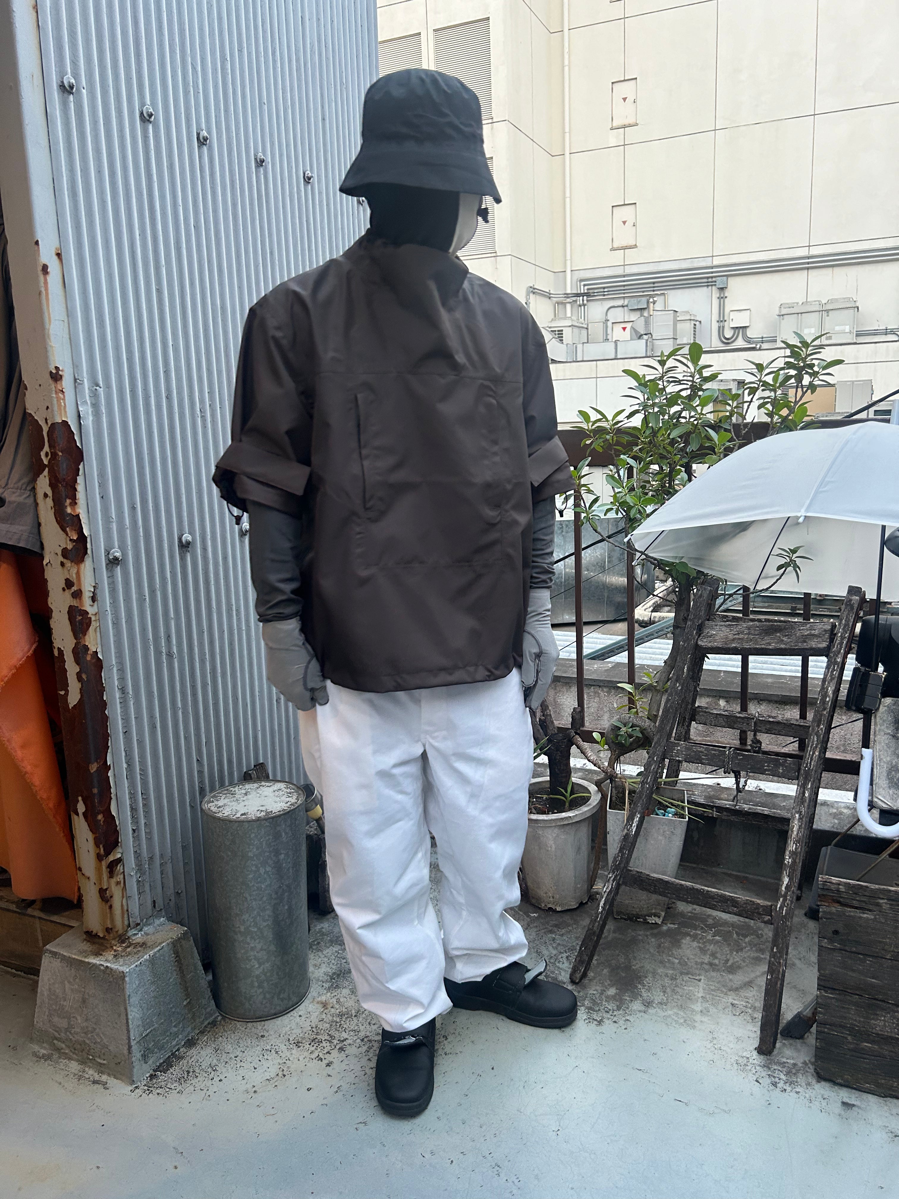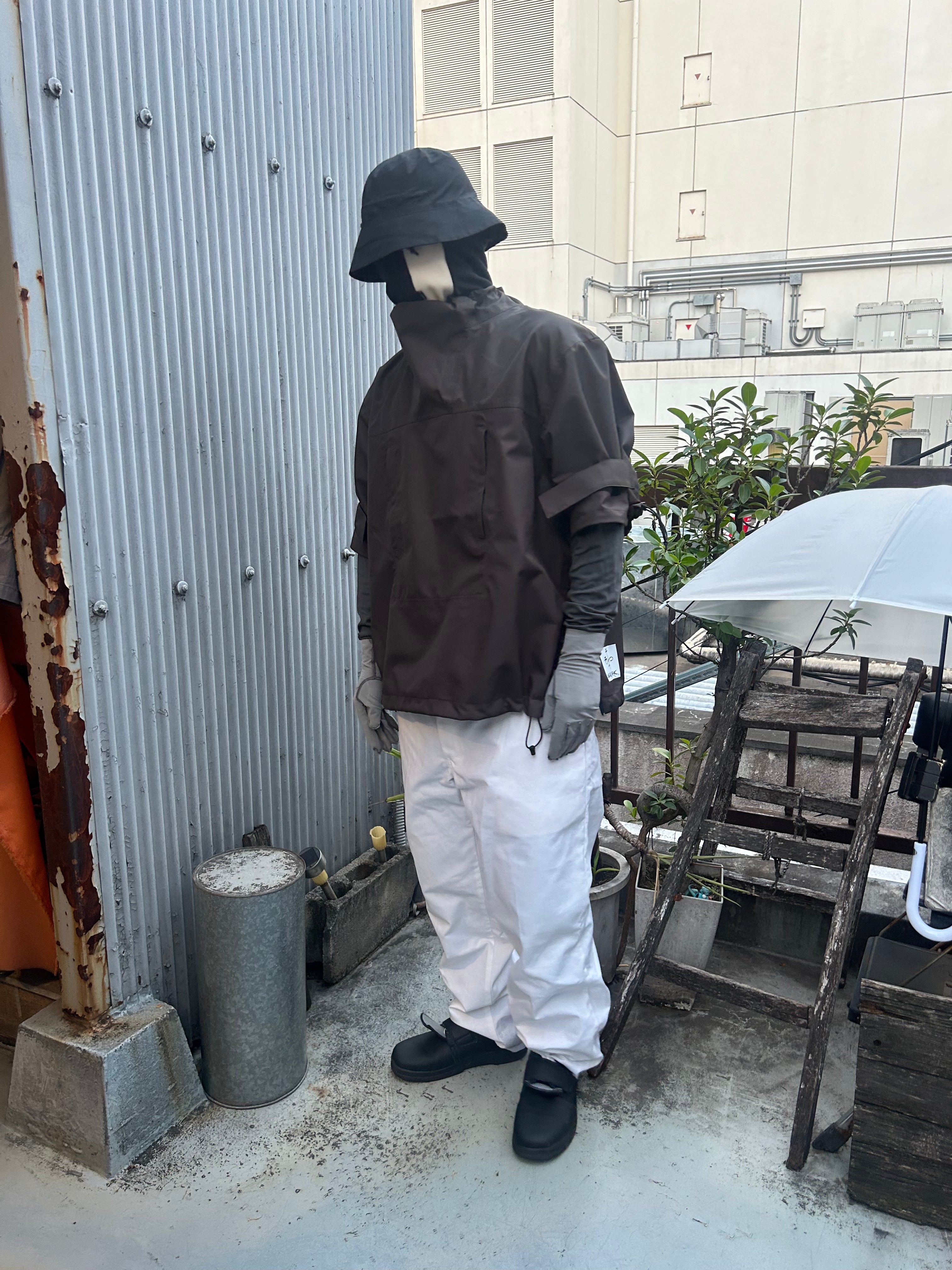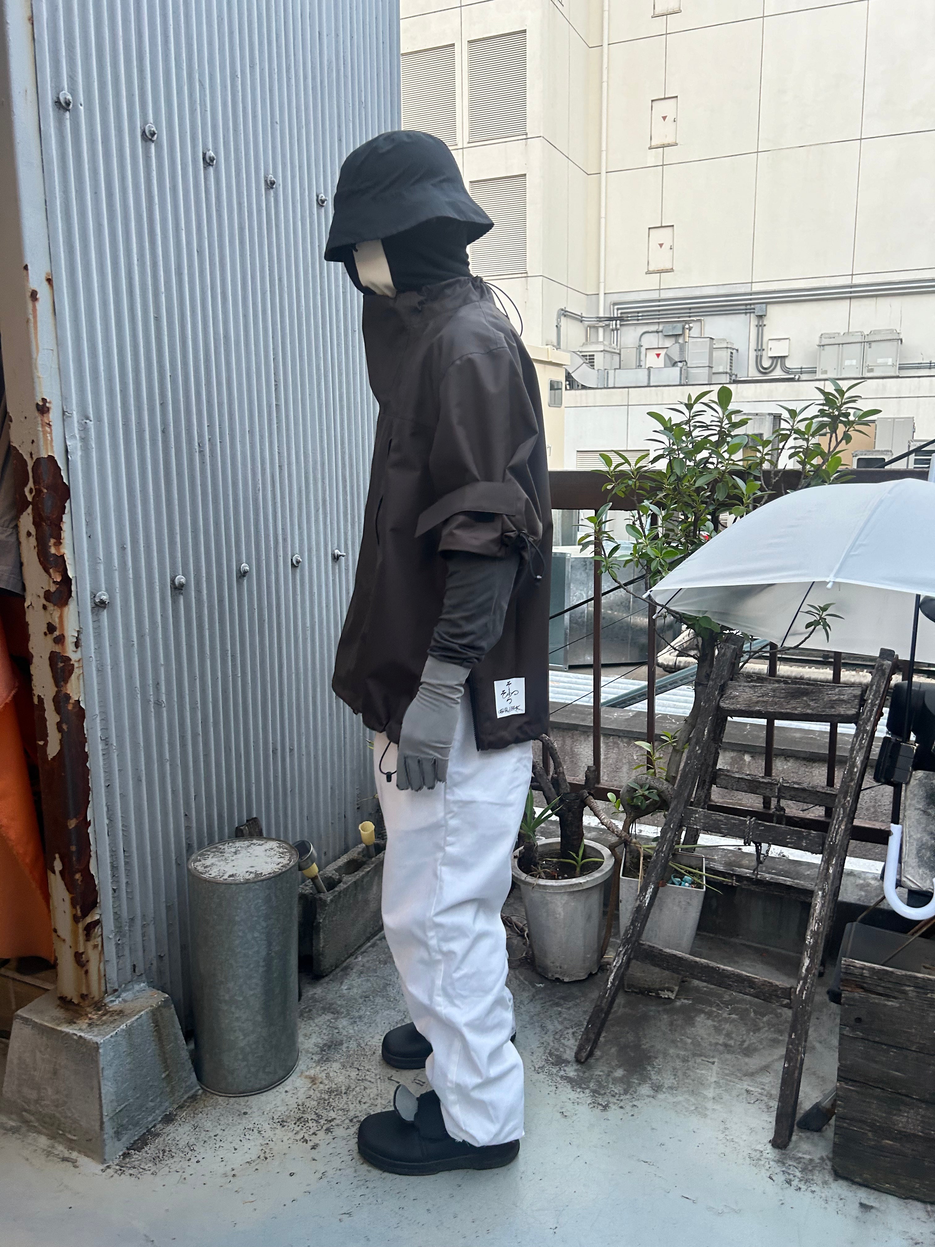 This product, designed by softs and engineered by GR10K, was conceived to address the need to adapt to Japan's increasingly subtropical environment, where tropical nights can reach 31°C (88°F) and sudden rainstorms can bring up to 100mm of rainfall in an hour. Key features include water-resistant material throughout, with short sleeves that can be opened using side zippers running from the hem to under the armpit, allowing for both protection from rain and enhanced ventilation when needed.
