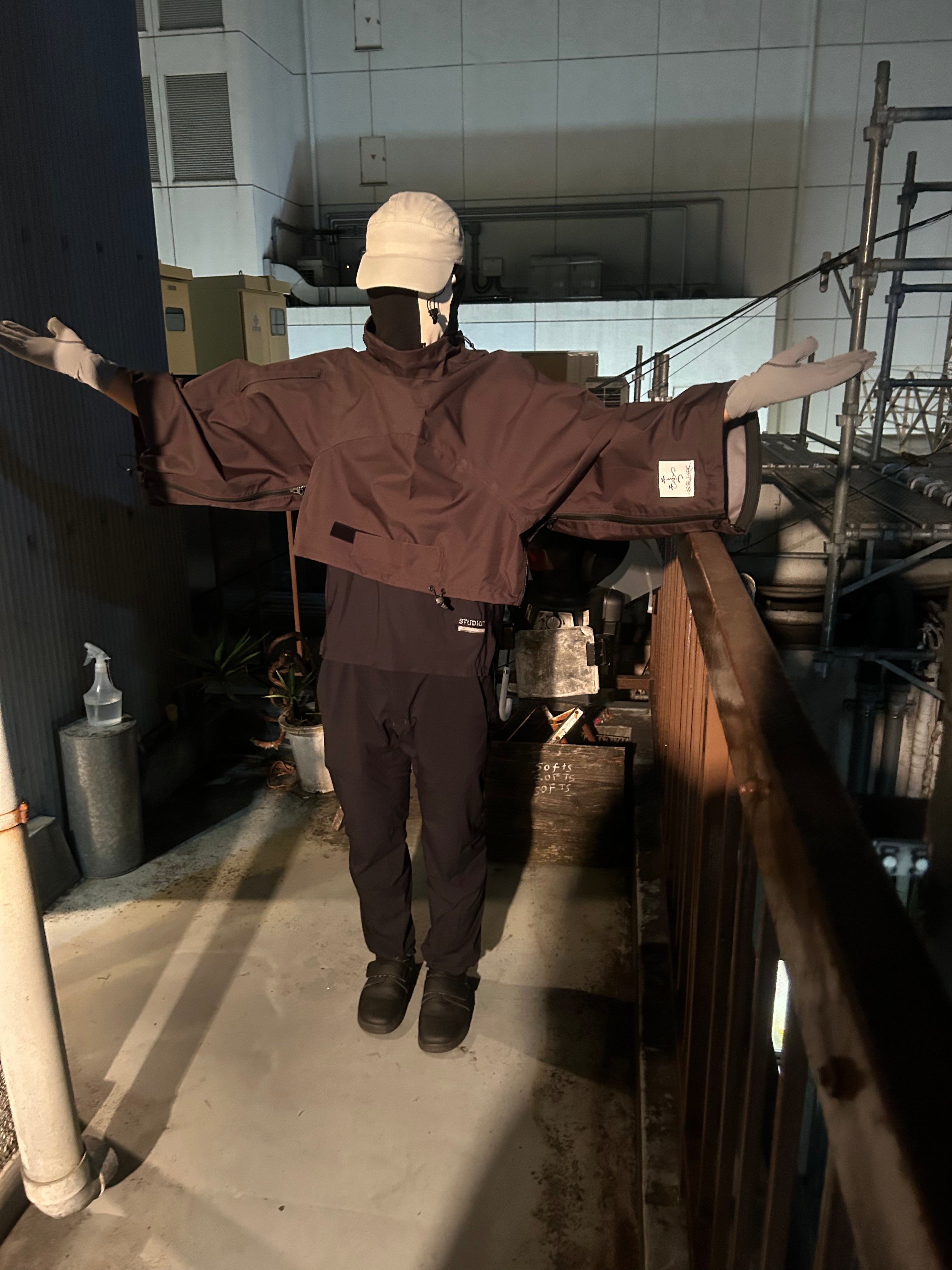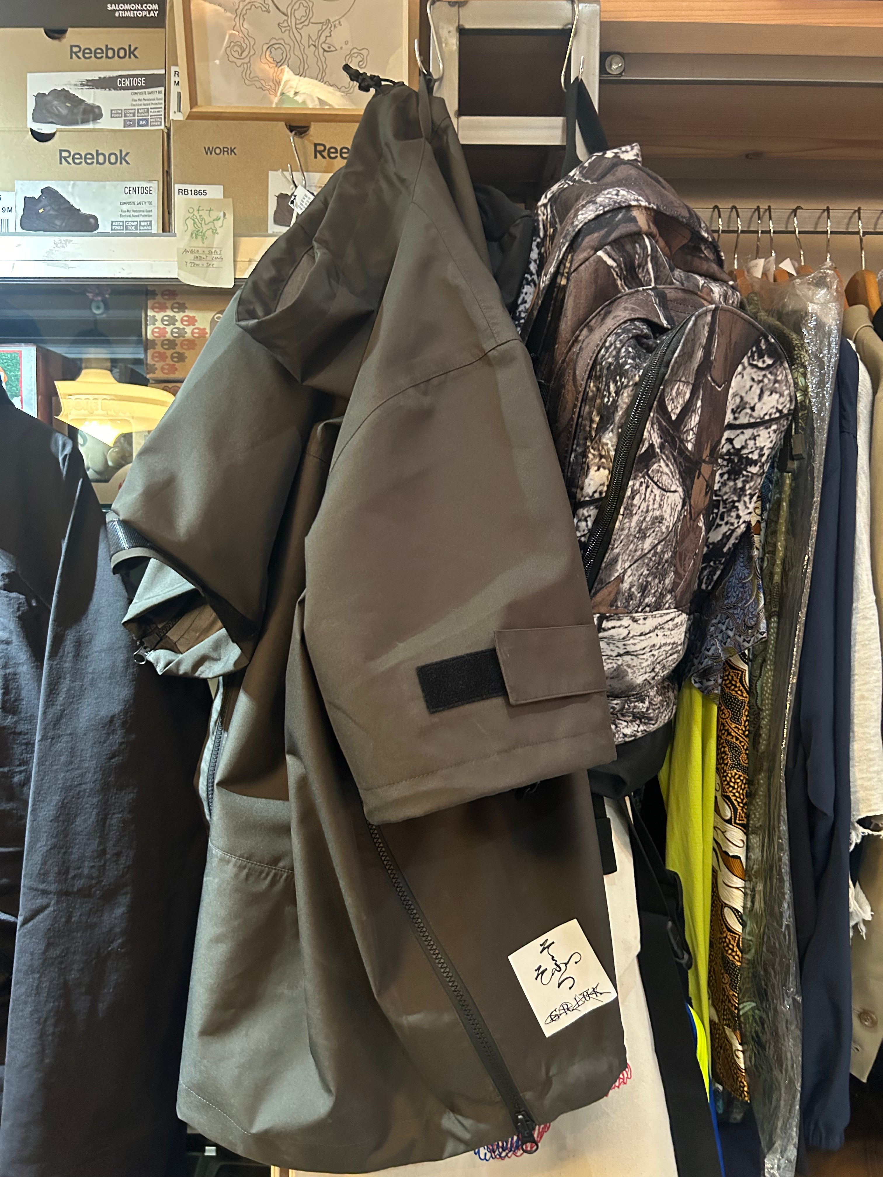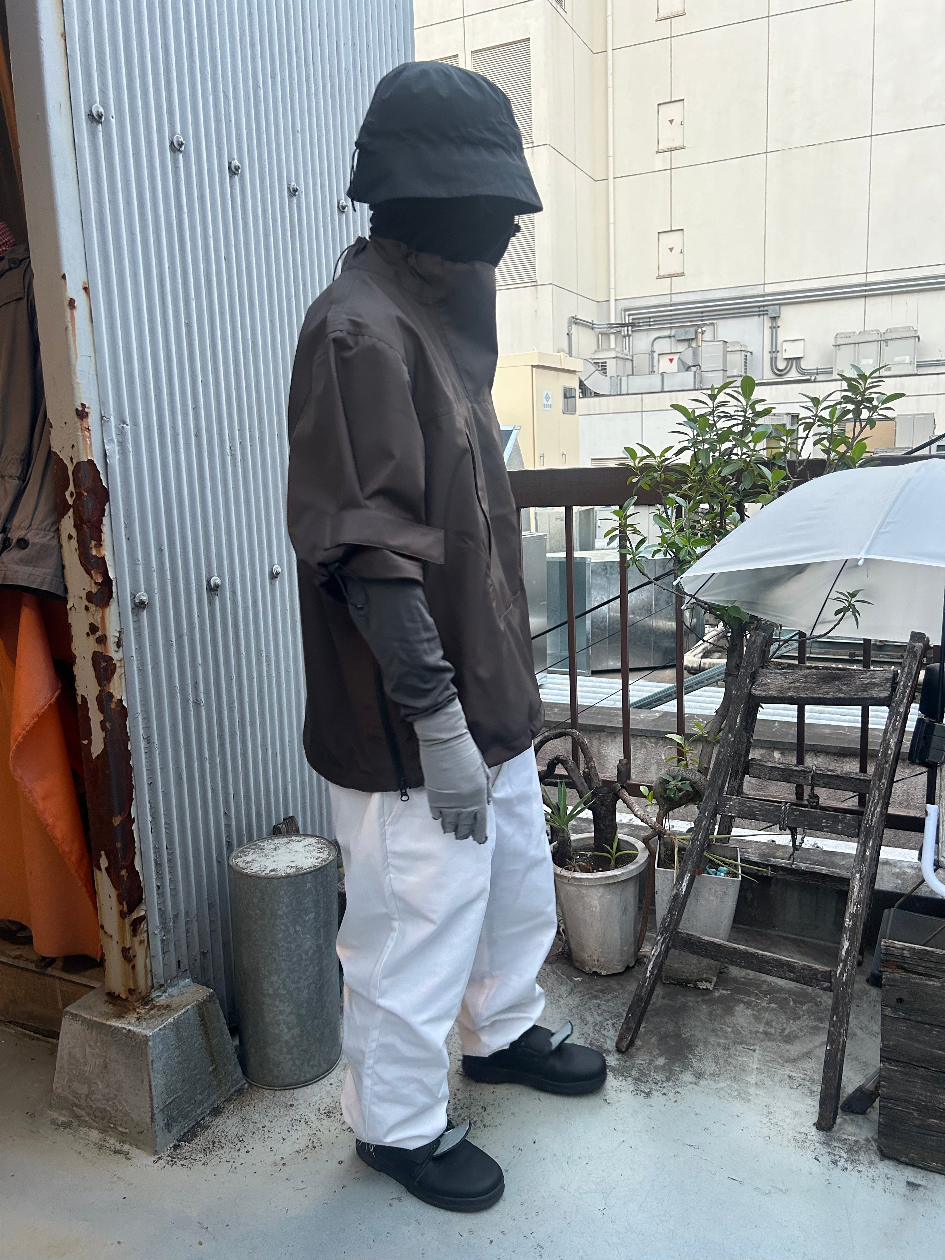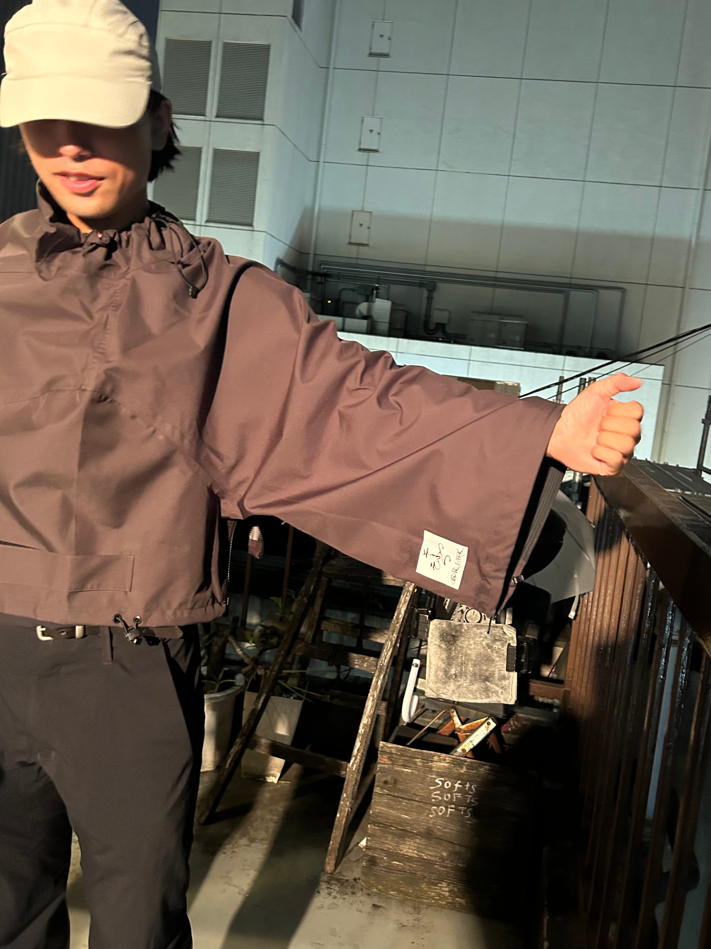 This product, designed by softs and engineered by GR10K, was conceived to address the need to adapt to Japan's increasingly subtropical environment, where tropical nights can reach 31°C (88°F) and sudden rainstorms can bring up to 100mm of rainfall in an hour. Key features include water-resistant material throughout, with short sleeves that can be opened using side zippers running from the hem to under the armpit, allowing for both protection from rain and enhanced ventilation when needed.